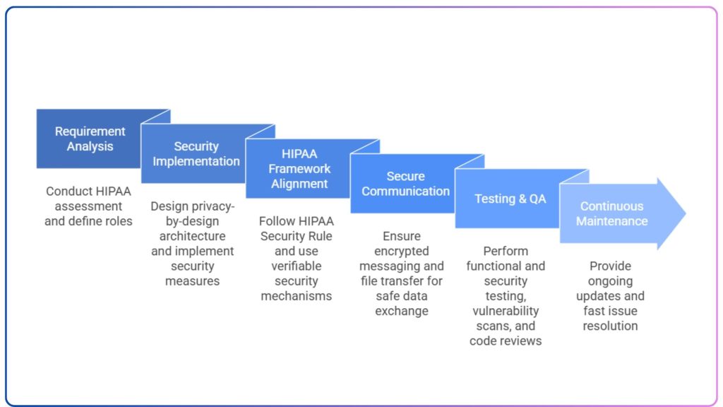 We start the development process with a detailed HIPAA compliance assessment and requirement analysis. This helps in identifying and implementing the right strategies and defining user roles and access levels according to HIPAA standards.